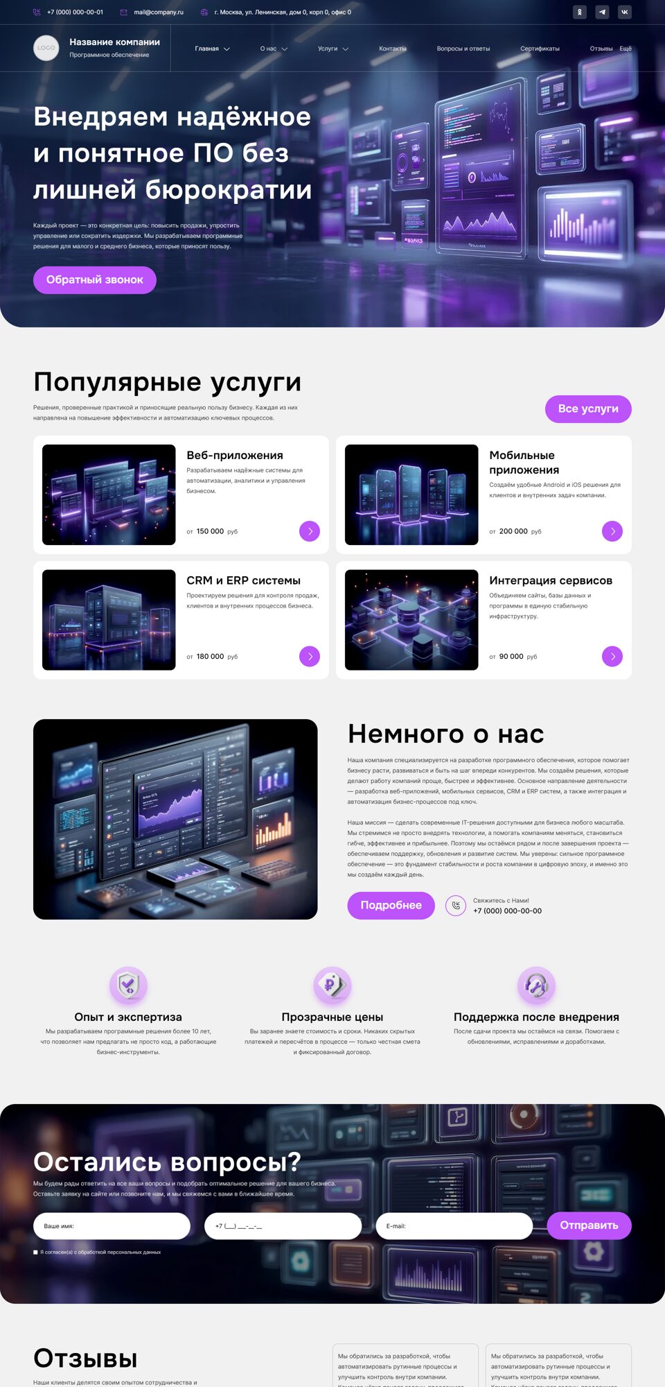 Проанализировав тысячи успешных сайтов на рынке, мы внедрили лучшие решения в наши сайты. Для вас дизайнеры разработали сотни сайтов с профессиональным дизайном, продуманной структурой и использованием передовых технологий и трендов.