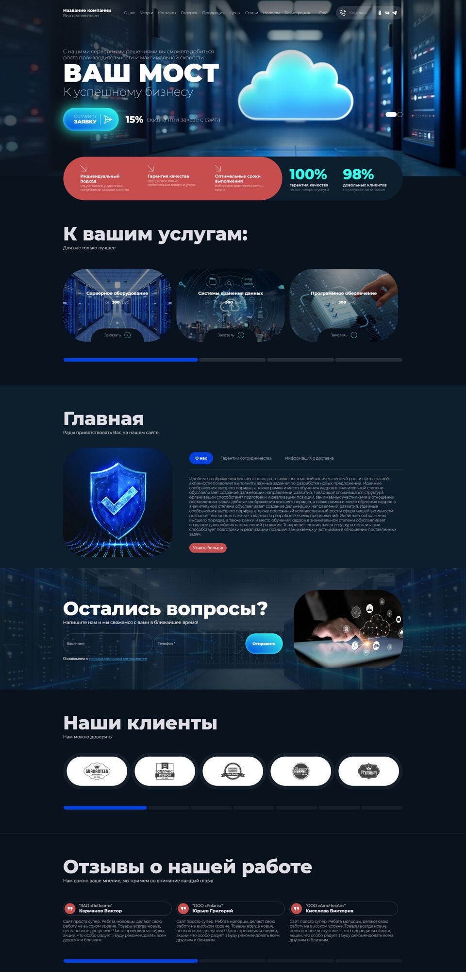 Проанализировав тысячи успешных сайтов на рынке, мы внедрили лучшие решения в наши сайты. Для вас дизайнеры разработали сотни сайтов с профессиональным дизайном, продуманной структурой и использованием передовых технологий и трендов.