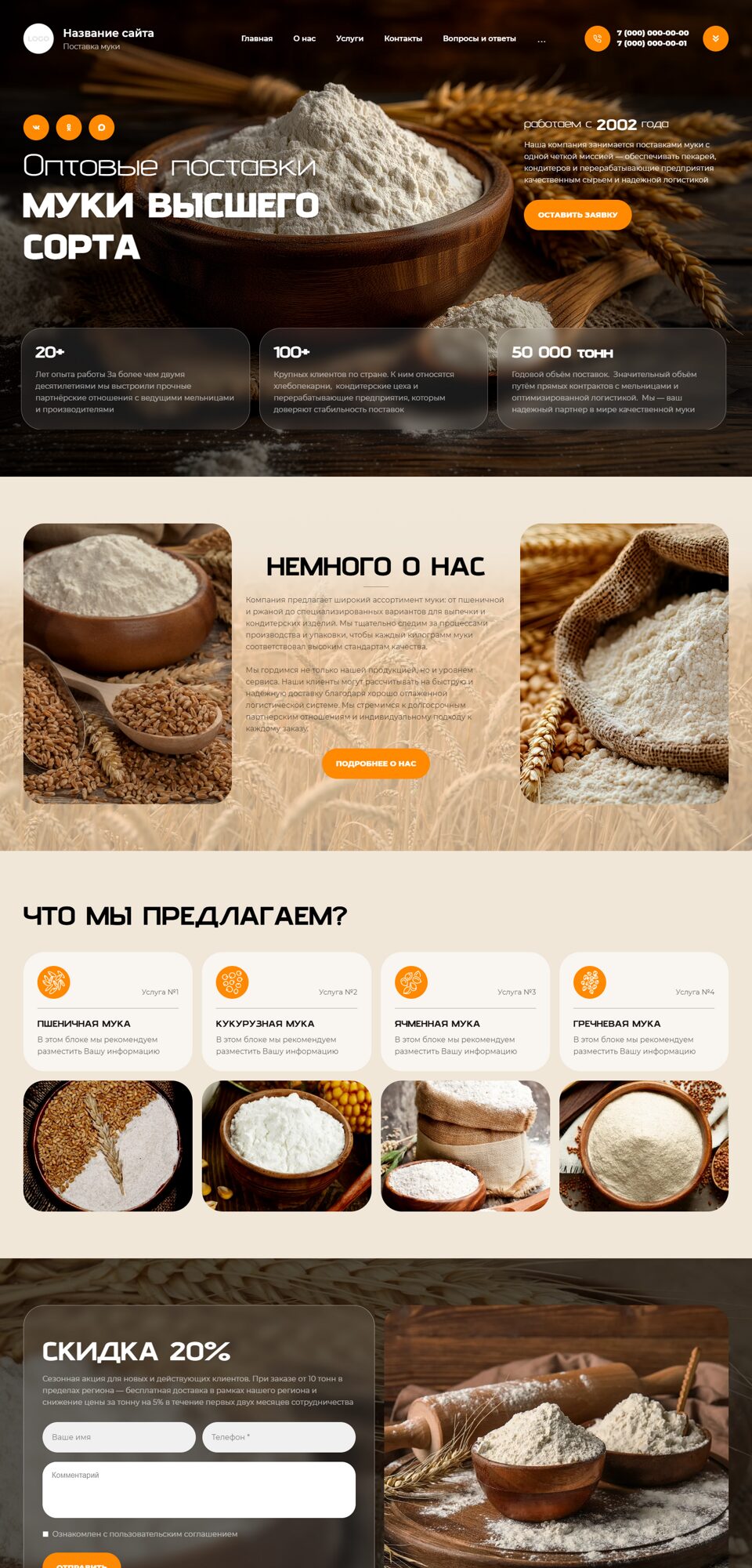 Производство муки и последующая ее реализация является сложной задачей для каждого предпринимателя. Если вы развиваете данный бизнес, вам, в первую очередь, нужно задуматься о покупке собственного сайта. Наша компания разрабатывает профессиональные веб-сайты на протяжении 20-ти лет. Мы являемся лидерами в данной сфере и используем уникальные методы и современные технологии в разработке бизнес-проектов. Каждый проект обладает высокой посещаемостью платежеспособных клиентов благодаря удобному поиску товара и гармоничному расположению информации на страницах. Готовые сайты для вашего бизнеса из категории “Мука” можно выбрать по следующим направлениям: мука пшеничная оптом, производство муки из различных зерновых культур, быстра и своевременная доставка ржаной муки, мельница и т.д. Заказав у нас веб-сайт, вы обретете эффективный инструмент, который увеличит спрос на ваши предложения. показать еще
