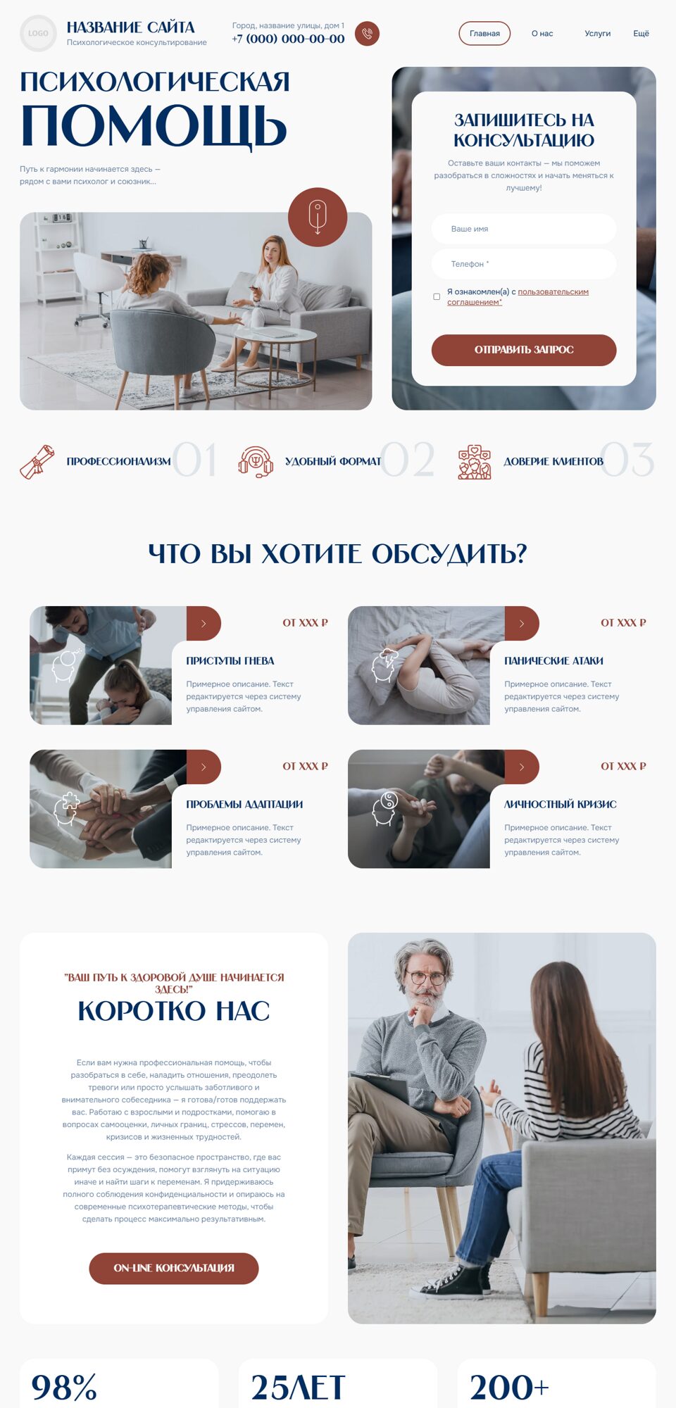Если вы оказываете услуги по решению вопросов, связанных с психологическими расстройствами или трудностями, то для быстрого развития бизнеса вам необходимо купить сайт у надежного разработчика эффективных интернет-ресурсов. Наша компания является создателем сайтов для бизнесов любой направленности. Наша команда состоит из высококвалифицированных сотрудников, обладающих 20-ти летним опытом работы. С каждым годом они совершенствуют свои навыки и создают проекты согласно современным требованиям. В категорию “Психологическое консультирование” мы включили следующие качественно разработанные готовые решения: работа с парами, травматерапия, помощь семье, тренинги личного роста, групповая психологическая помощь и т.д. Закажите у нас тщательно разработанный сайт для поддержания имиджа вашей компании. Вы получите веб-ресурс для охвата большой аудитории покупателей. показать еще